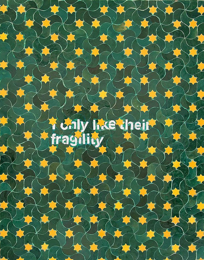 +"description": "‘I only like their fragility’ is part of the ‘But me’ series, a project that led Diego Miguel Mirabella to work with local artisans in Fès. Here, transformed into art, language becomes an ornament."