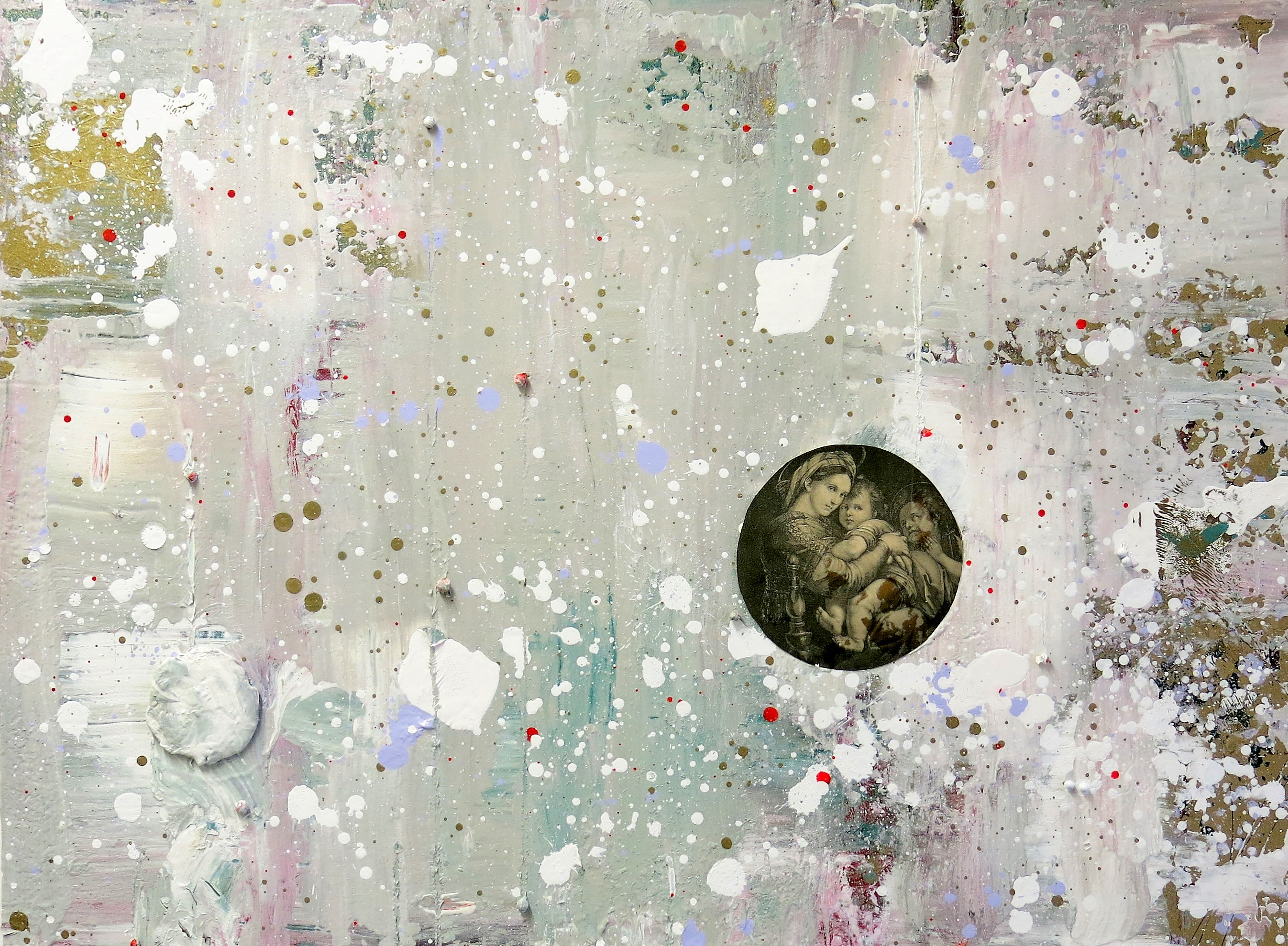 Lapo Simeoni's work originates from a lithograph, drawing inspiration from the context of the nineteenth/twentieth century, a historical period of research and discovery defined by the artist as "the illusion of the perfect century". In this artwork, it is possible to identify Simeoni's mastery of the imaging technique, which evocatively tells the story of late 19th-century Germany in full evolution and growth. Through the use of spray and varnish, the artist has tried to visually reproduce a nebulous universe over the lithography, in order to create a sort of temporal archive, generating a cocoon-like environment that holds memories, to be then discovered through drops of colour, evoking infinite temporal possibilities.