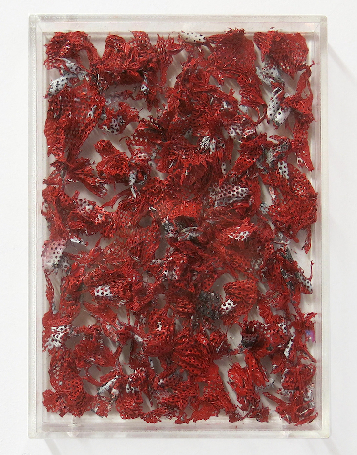 Lapo Simeoni's 'Red Skin' belongs to the "Things Left Unsaid" series, which focuses on the perception of matter and on the complexity of waste materials in the artwork's visual process. The artist wants to analyse the potentialities of scraps, making them the protagonist of his piece.